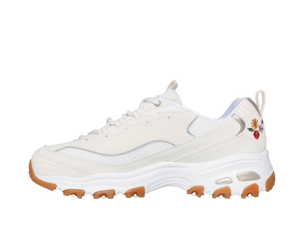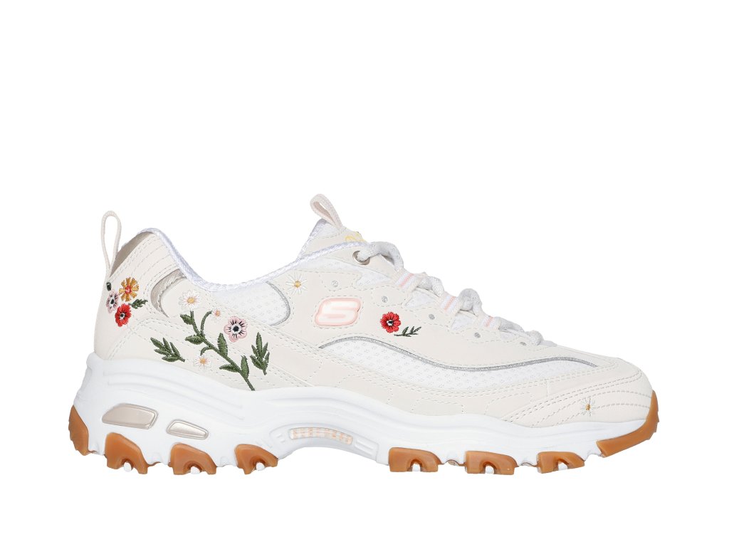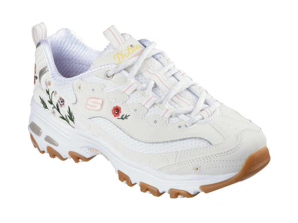 Vyjděte ven v ikonickém květinovém stylu v botách Skechers D'Lites - Spring Bloom. Tento ležérní šněrovací model má horní díl z dura kůže s vyšitými květinami. Nechybí ani mezipodešev tlumící nárazy a polstrovaná stélka Skechers Air-Cooled Memory Foam™.