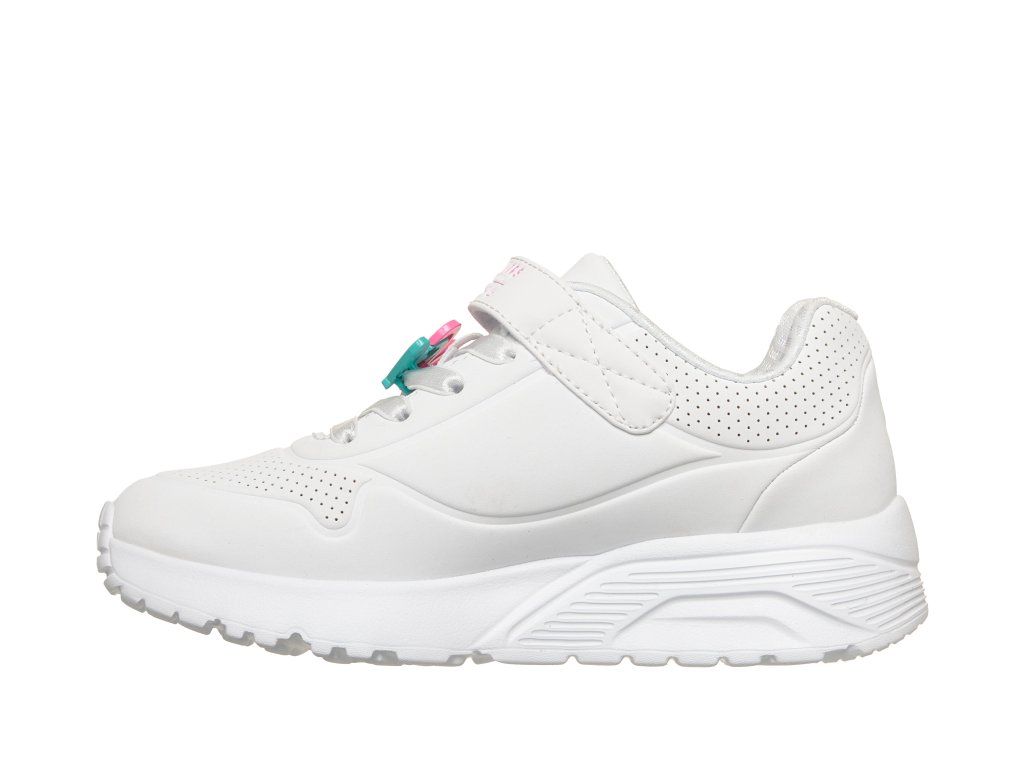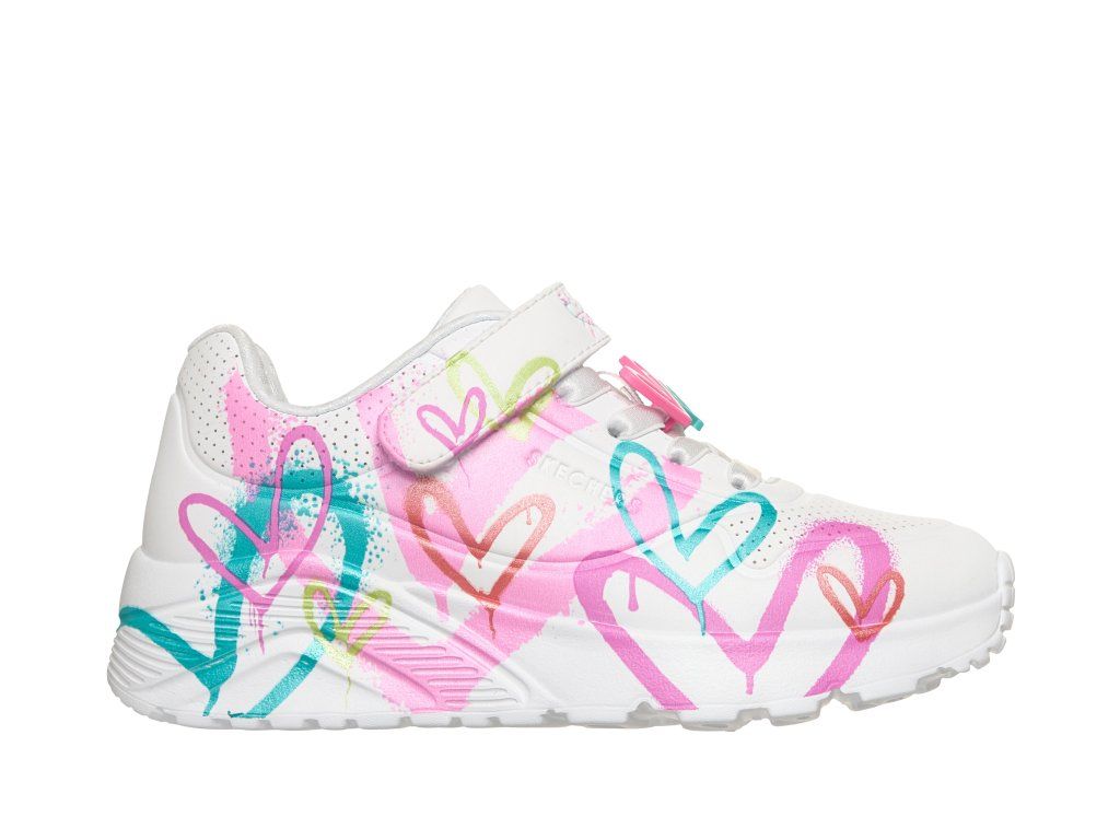 Mezinárodně proslulý umělec James Goldcrown přináší do společnosti Skechers v této inspirující spolupráci kultovní vzory srdce #Lovewall. Zažij lásku na každém kroku díky Skechers Street™ x JGoldcrown: UNO Lite - Heart Status. Tento model s nastavitelným zapínáním Skechers má perforovaný syntetický svršek s autorským motivem srdcí, který přechází až na podešev. Dále nabízí elastické tkaničky s ladicím přívěskem, nastavitelný nártový pásek a komfortní stélku Skechers Air‑Cooled Memory Foam™.“
